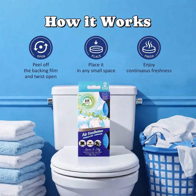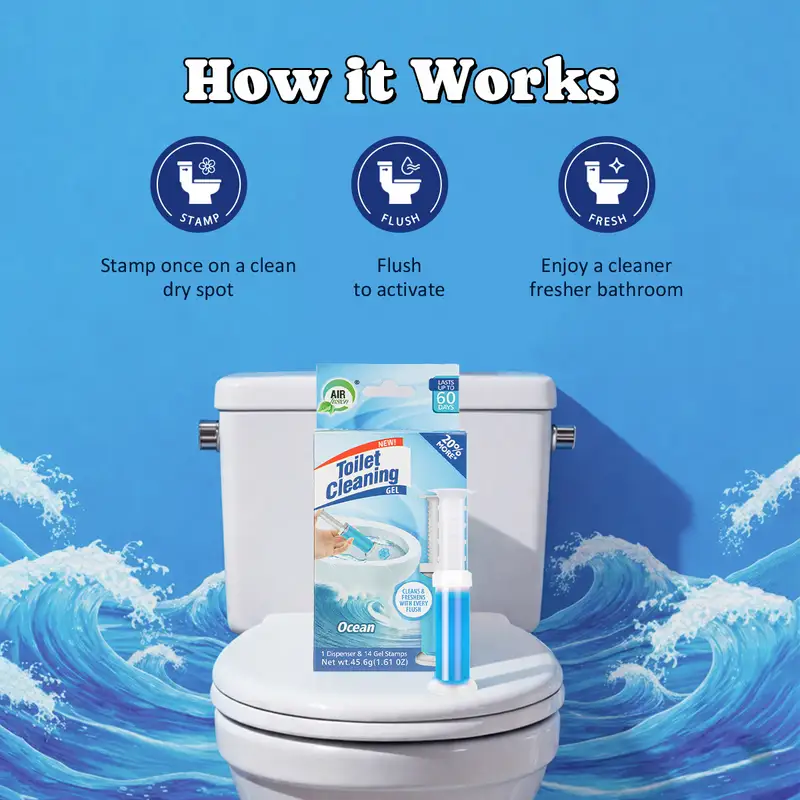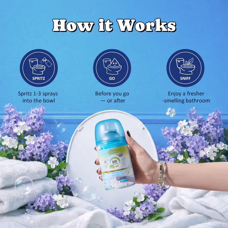 • 3 Ways to Keep Bathroom Moments Fresh. Includes a spray for instant odor control, a toilet cleaning stamp for daily freshness, and an air freshener gel for continuous scent.