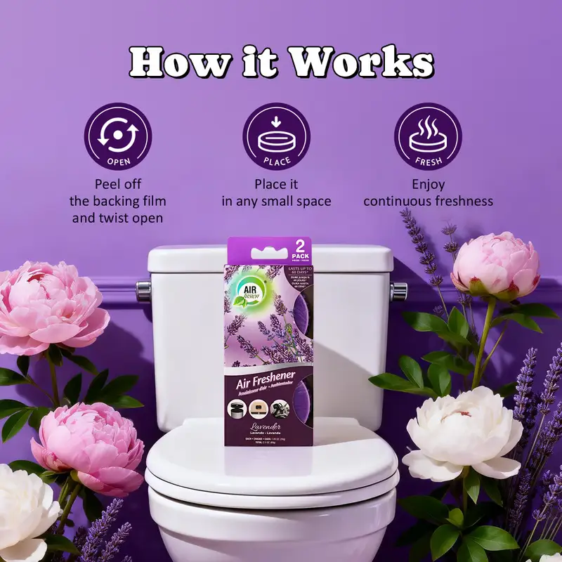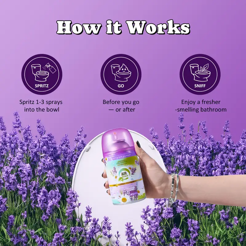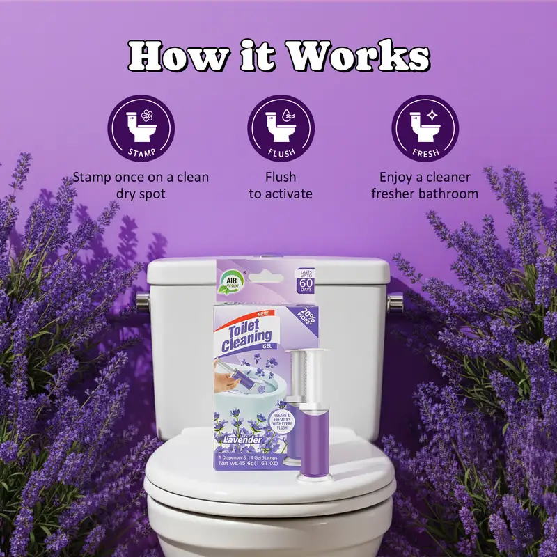 • 3 Ways to Keep Bathroom Moments Fresh. Includes a spray for instant odor control, a toilet cleaning stamp for daily freshness, and a stick-on air freshener gel for continuous scent.